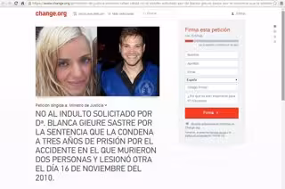 Frente a esta solicitud de indulto, familiares y amigos de las víctimas mortales y del joven que también resultó herido en el accidente han abierto una página en la plataforma digital Change.org, en la que se pide apoyo para "No" al indulto solicitado por la joven porque "no podemos permitir que alguien que mató a dos personas y lesionó a una tercera continúe con su vida sin pagar por lo que hizo", dice textualmente.