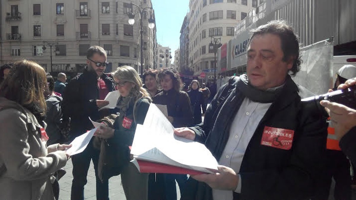 Trabajadores y familiares de usuarios de centros y servicios de atención a personas con discapacidad han presentado este jueves en el registro de la Dirección Territorial de Bienestar Social de Valencia dos recursos de alzada --uno por cada grupo-- contra la aplicación de la nueva ley de tasas del Consell en un "acto simbólico" para "visibilizar" la situación en la que se encuentran y que provoca que numerosas personas tengan que darse de baja de los centros.