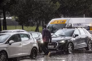 Archivo - Un hombre camina entre varios coches mientras la lluvia cae en imagen de archivo - Rober Solsona - Europa Press - Archivo