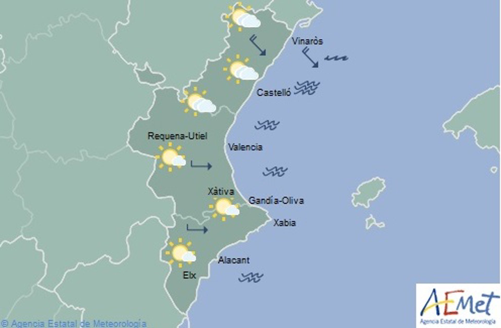 Las temperaturas se mantendrán sin cambios o irán en descenso y no superarán los 22 grados en Castellón, los 21 en València y los 20 en Alicante. El viento soplará de componente oeste flojo en general, moderado o fuerte al norte de Castellón, tendiendo a disminuir por la tarde quedando la componente variable.