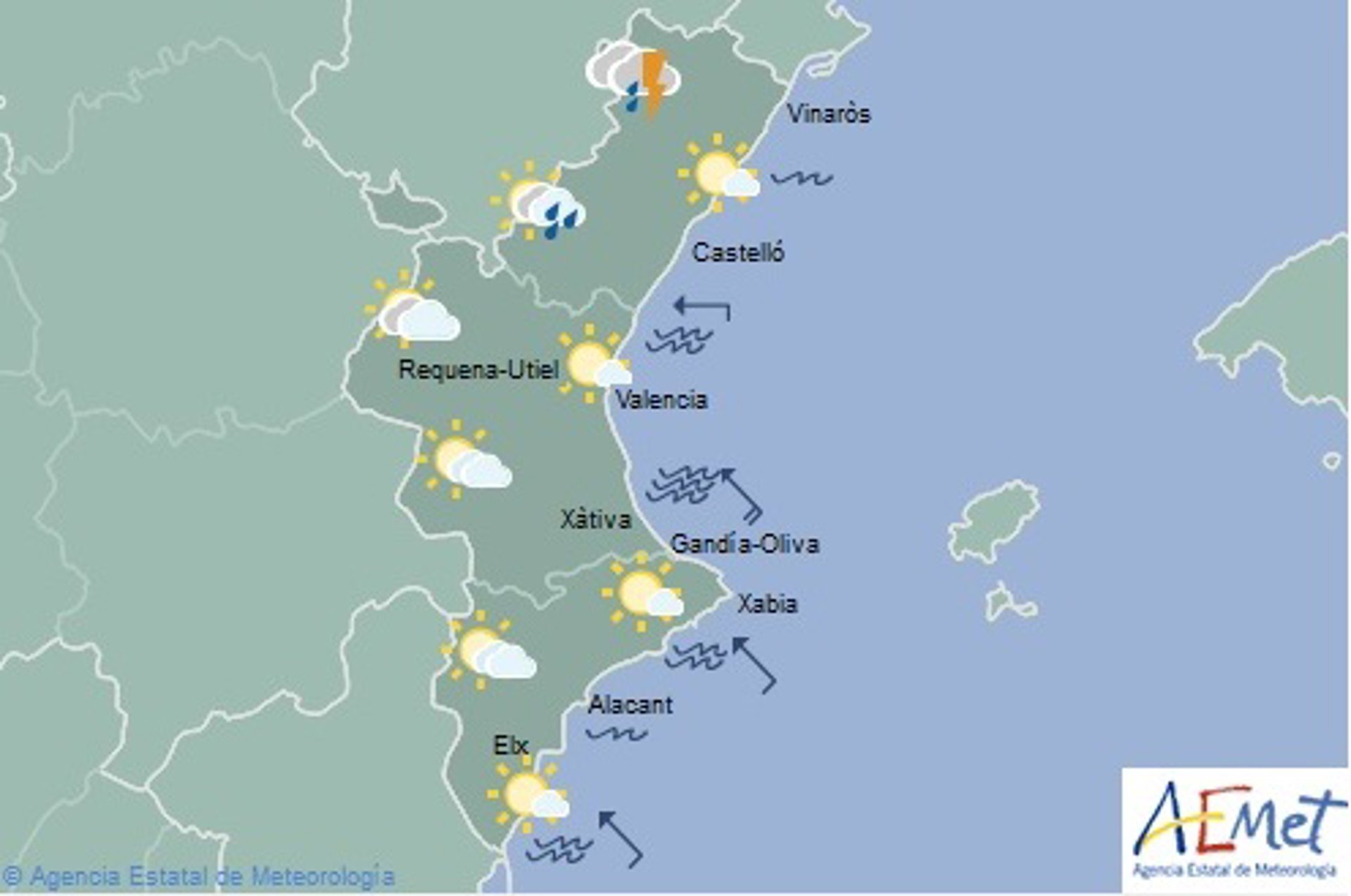 Las temperaturas se mantendrán sin cambios importantes con máximas de 35 grados en Castellón, València y Alicate. El viento soplará variable flojo tendiendo por la tarde a componente este flojo, con intervalos de moderado en la costa.