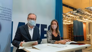 El director gerente de la Fundació per al Foment de la Investigació Sanitria i Biomdica de la Comunitat Valenciana (Fisabio), José Antonio Manrique, y la directora de Las Naves, Marta Chillarón, firman el convenio del concurso De major vull ser com... - LAS NAVES/FISABIO