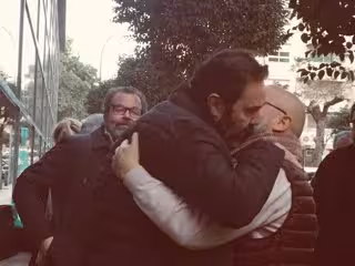 Miguel López se abraza a un amigo a la salida del juzgado tras conocerse ayer que el jurado le había declarado no culpable. - EUROPA PRESS