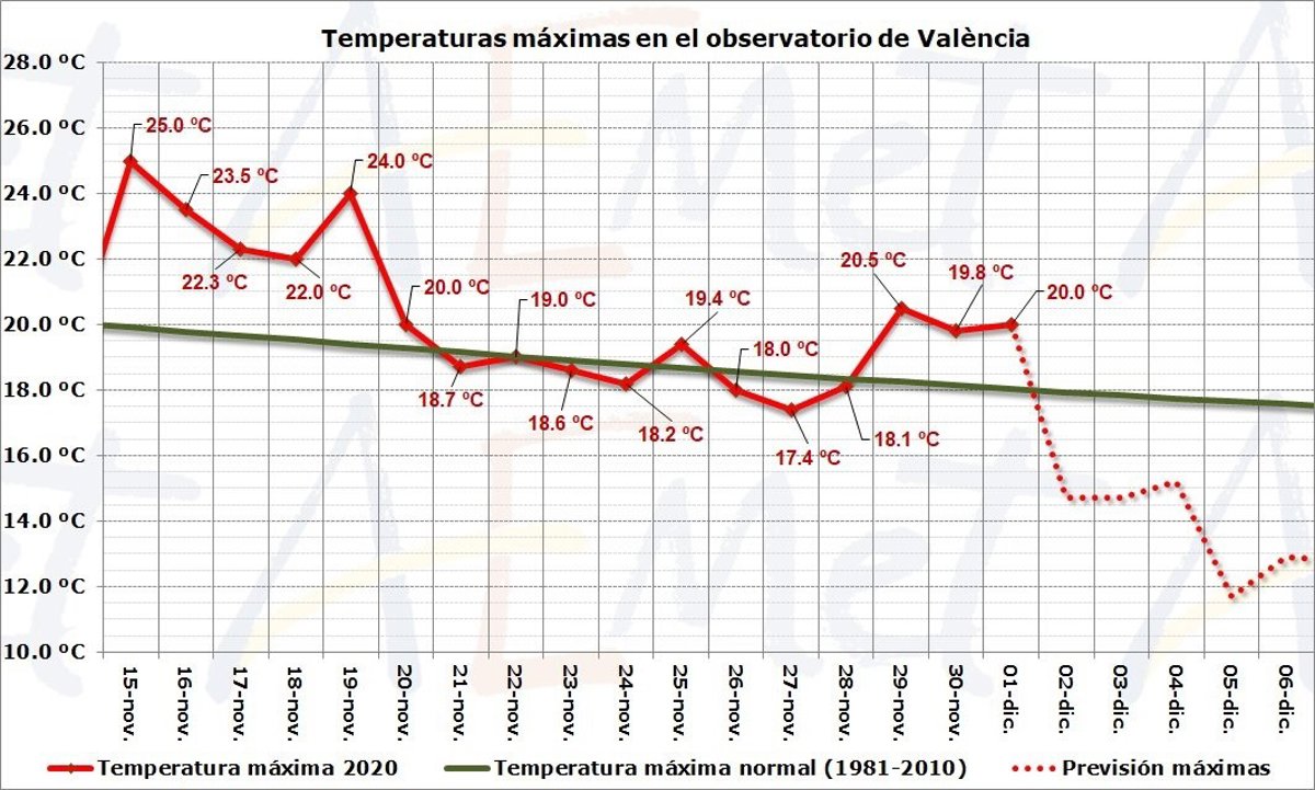 La Agencia Estatal de Meteorología (Aemet) prevé que a partir de este miércoles la Comunitat Valenciana registre un descenso de temperaturas y se acentúe la sensación de frío, después de un mes de noviembre que ha calificado de "muy cálido".