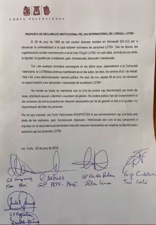 Compromís ha planteado este miércoles una declaración institucional para ser leída en el pleno de Les Corts Valencianes en la que se manifestaba el reconocimiento a la lucha por los derechos del colectivo LGTBI, así como el compromiso de impulsar en la labor parlamentaria todas las medidas necesarias para erradicar la discriminación y violencia hacia estas personas, texto que no ha salido adelante y no ha podido ser leído al no contar con el apoyo de Vox.
