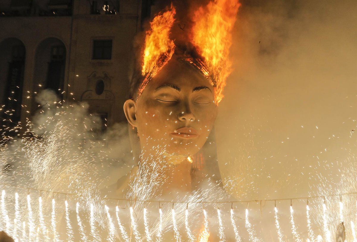 De esta forma, la cabeza de la Meditadora, la figura que se ha convertido en símbolo de la pandemia en la ciudad, ha ardido año y medio después de que su cuerpo y parte principal del monumento desaparecieran en una 'crem' también sin público, el 17 de marzo de 2020, sin ser anunciada y en las primeras fiestas de España suspendidas por la covid-19, con el país bajo el estado de alarma.