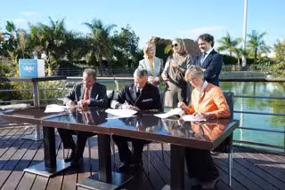 El jefe del Estado Mayor de la Defensa, el almirante general Fernando García Sánchez; el director general de Cacsa, Enrique Vidal, y la presidenta de la Fundación Oceanogràfic, Celia Calabuig, han firmado este viernes un acuerdo de colaboración con los leones marinos como protagonistas.
