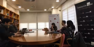 Las autoras y autores Samuel Sebastian, Jerónimo Cornelles (tutor), Marta Chust, Rubén Rodríguez y Arantxa Talón, en una sesión del Laboratorio de Escritura Teatral 'La memoria de nuestras calles: FANG', en la sede valenciana de SGAE. - SGAE