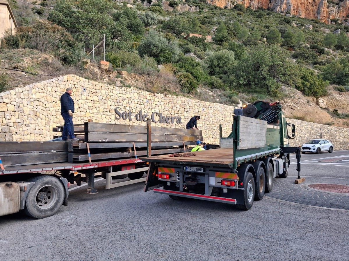 La Vicepresidencia Tercera y Conselleria de Medio Ambiente, Infraestructuras, Territorio y de la Recuperación ha completado el traslado en fases por el núcleo urbano de las estructuras metálicas de las nuevas pasarelas que se van a instalar en Sot de Chera (Valencia) en el marco de los procesos de reconstrucción tras las riadas que arrasaron las anteriores pasarelas.