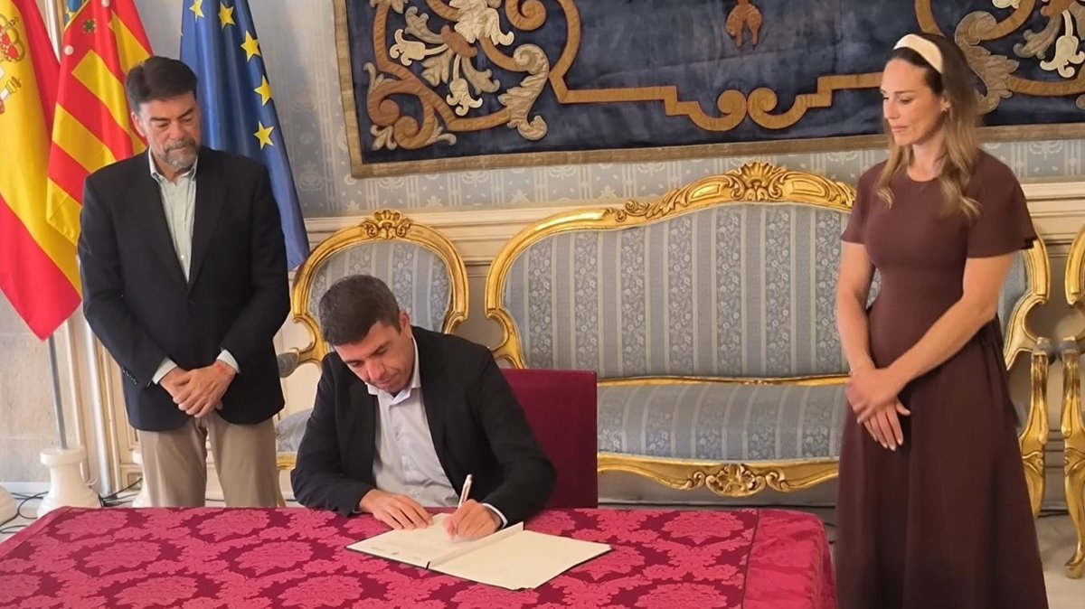 El 'president' de la Generalitat, Carlos Mazón; el alcalde de Alicante, Luis Barcala, y la directora de desarrollo de negocio del Grupo Cívica, Laura Ortiz, han firmado este viernes el protocolo para la rehabilitación, mejora y regeneración paisajística, medioambiental y de la biodiversidad en el entorno de la Serra Grossa.
