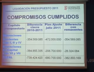 La Generalitat valenciana cerró el ejercicio 2011 con un déficit financiero de 1.543,2 millones de euros, frente a los 379,9 millones de euros del año anterior, según ha informado el conseller de Hacienda y Administraciones Públicas, José Manuel Vela.