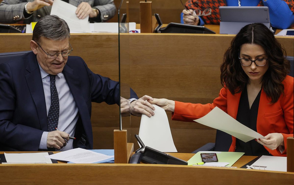 El presidente de la Generalitat valenciana, Ximo Puig y la vicepresidenta, portavoz y consellera de Igualdad y Políticas Inclusivas de la Generalitat valenciana, Aitana Mas, intercambian documentos durante una sesión de control - Rober Solsona - Europa Press