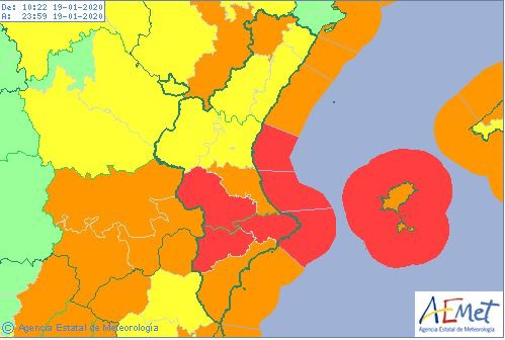 Sobre la misma hora, prevalecerá la alerta roja por fenómenos costeros en el litoral de Valencia y el litoral norte de Alicante, naranja en el caso del litoral de Castellón. Así, se prevé olas de siete y ocho metros y vientos del nordeste fuerza nueve, ocasionalmente diez.