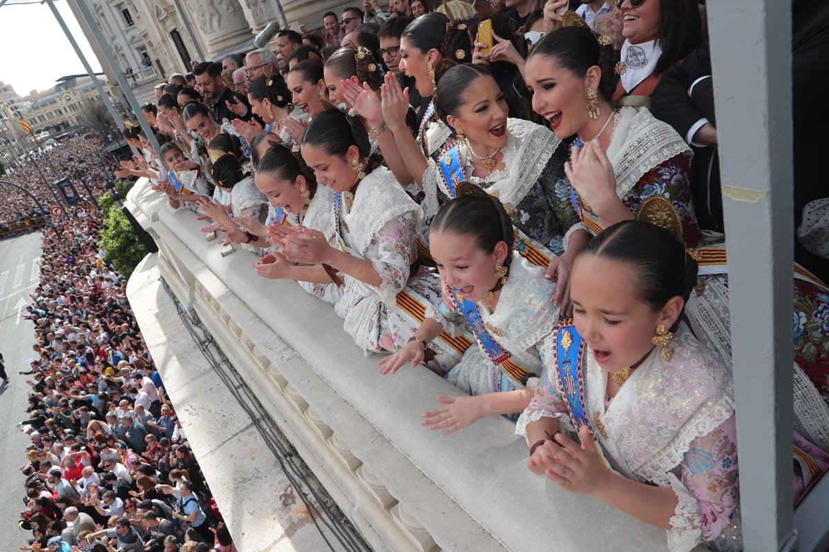 Imagen del balcón principal del Ayuntamiento de Valncia durante la novena 'masclet' de las Fallas de 2020 disparada este lunes. - AYUNTAMIENTO DE VALNCIA