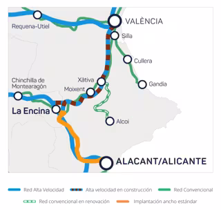 La adaptación al ancho internacional de este tramo, con la implantación del tercer carril y la nueva configuración de vías para trenes de hasta 750 metros, se unirá a la implantación del tercer hilo entre La Encina-Bifurcación Xàtiva, en su conexión con el baipás de Almussafes-València Font de Sant Lluís.