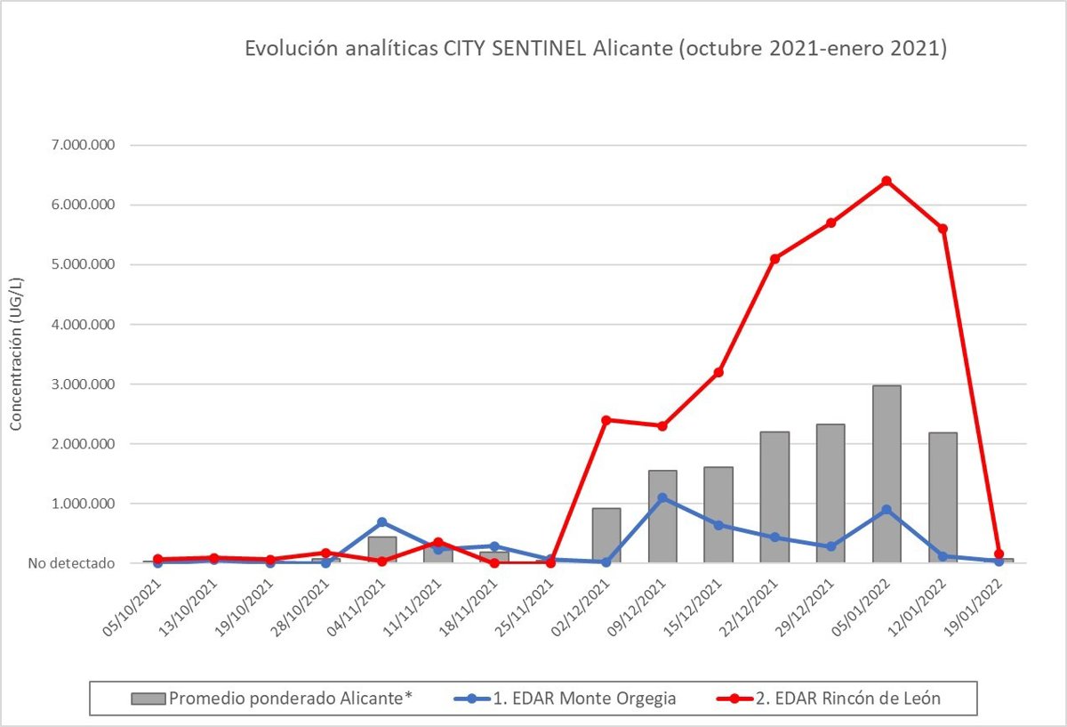 Eolución analítica Alicante Octubre-Enero covid en aguas residuales - CITY SENTINEL