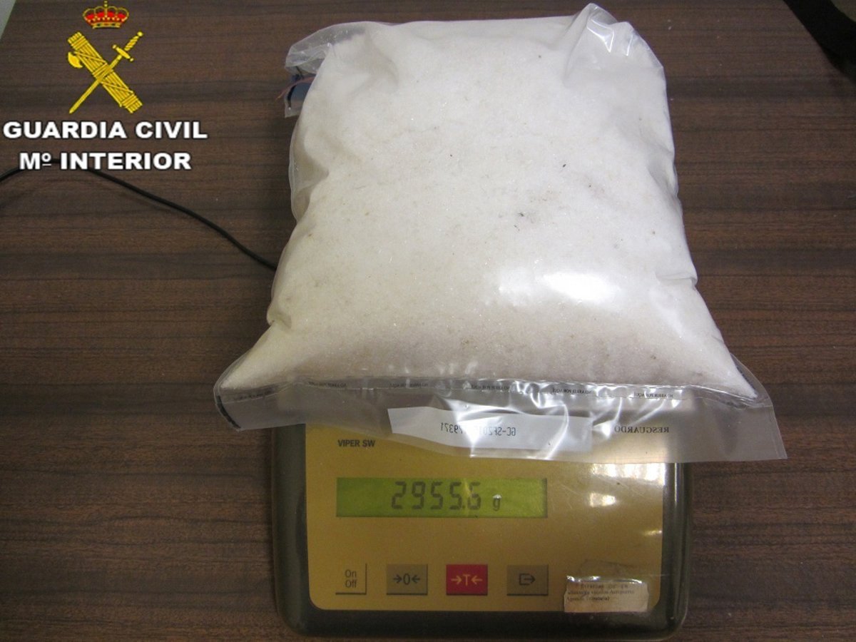 En el registro practicado por la Guardia Civil al equipaje de esta persona, los agentes observaron que tenía un "peso excesivo" y una placa de materia orgánica en la estructura de la maleta, por lo que realizaron una punción de la estructura, donde hallaron una sustancia en forma de cristal que dio positivo a menfetamina.