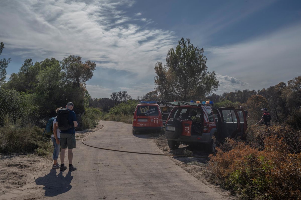 Furgones de bomberos frente a la vegetación afectada por el incendio forestal declarado en el Saler - Jorge Gil - Europa Press