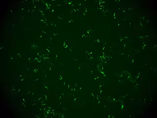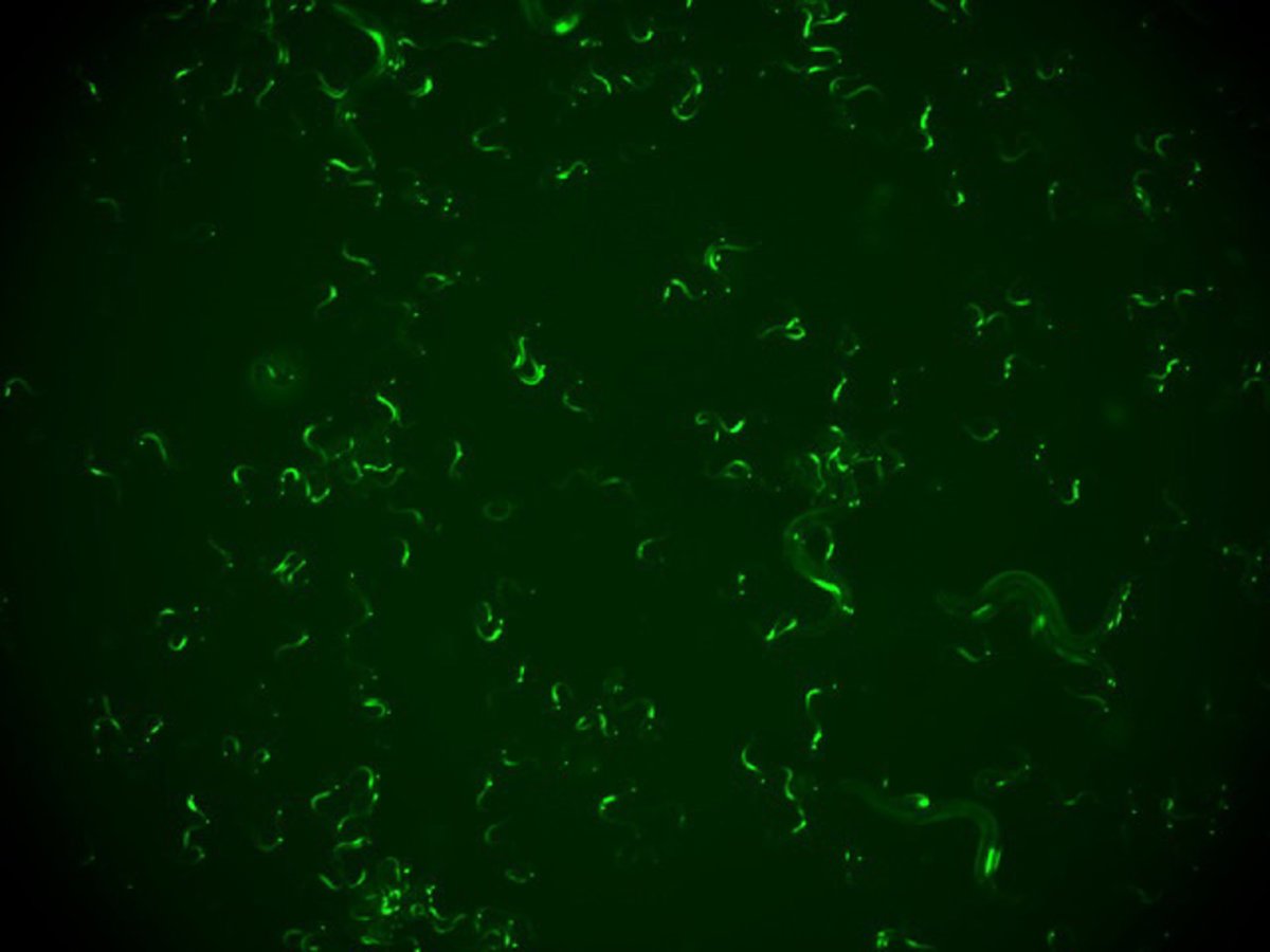 Grupo de C. Elegans infectados visualizados con una lupa. La fluorescencia verde corresponde con las células infectadas y permite distinguir animales infectados de sanos. - I2SYSBIO-CSIC-UV