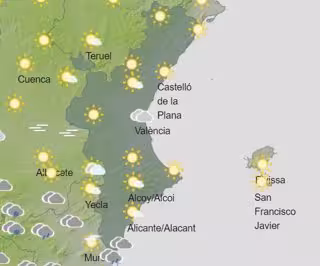 En cuanto a las temperaturas, las mínimas experimentarán ascensos en el norte de Castellón y el sur de Alicante, y se mantendrán sin cambios o en ligero descenso en el resto. Las máximas, por su lado, no sufrirán cambios respecto al viernes.
