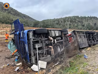 Un hombre de 47 años ha resultado herido con politraumatismo tras salirse de la vía y volcar el camión que conducía en la carretera CV-50, a la altura de Alzira (Valencia), en el cruce con la carretera Carcaixent.