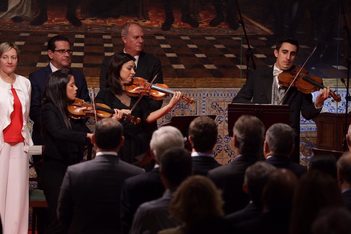 El acto institucional del 9 d'Octubre ha vivido este año por primera vez la interpretación de los himnos de la Comunitat valenciana y España con música en directo, a cargo de solistas de cuerda, viola, violonchelo y trompeta de ADDA Sinfònica (Orquesta Sinfónica de la Diputación de Alicante).
