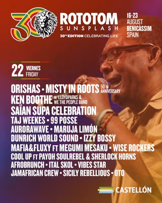 Este viaje musical por las 30 ediciones de Rototom Sunsplash lo completan sobre el 'Main Stage' el "legendario" artista jamaicano Ken Boothe, que construirá su show a ritmo de rocksteady y soul junto a Lloyd Parks; We The People Band, y la "potencia lírica y escénica" de Saïan Supa Celebration.