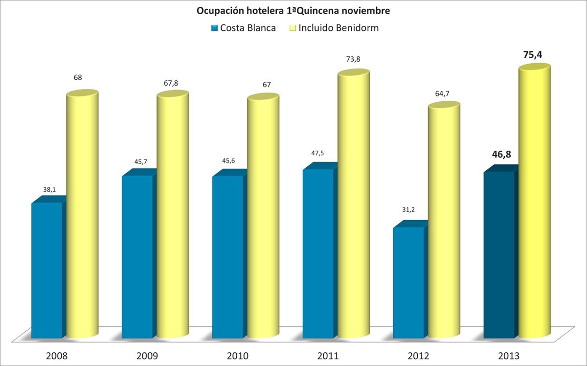 La previsión de la patronal hotelera es que los hoteles de la Costa Blanca, exceptuando Benidorm, cierren la segunda mitad de noviembre con una ocupación media 48,1 por ciento, 10,7 puntos más que en 2012, y el mejor dato de los últimos seis años.