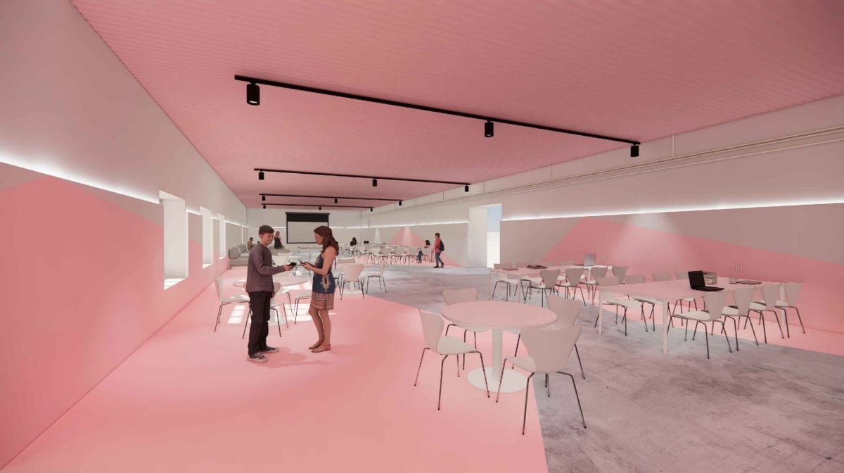 En la intervención prima la renovación de los acabados y las instalaciones, se apuesta por una nueva imagen que aporte color y mantenga la estética industrial mediante la articulación del diseño con el uso de chapa perforada de color en el revestimiento de fachada de aseos y falso techo de nave taller y también se ha diseñado para que pueda contar con iluminación y ventilación natural.