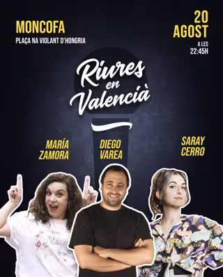 Cartel de la actuación en Moncofa (Castellón) de los humoristas Maria Zamora, Saray Cerro y Diego Varea - RIURES EN VALENCI