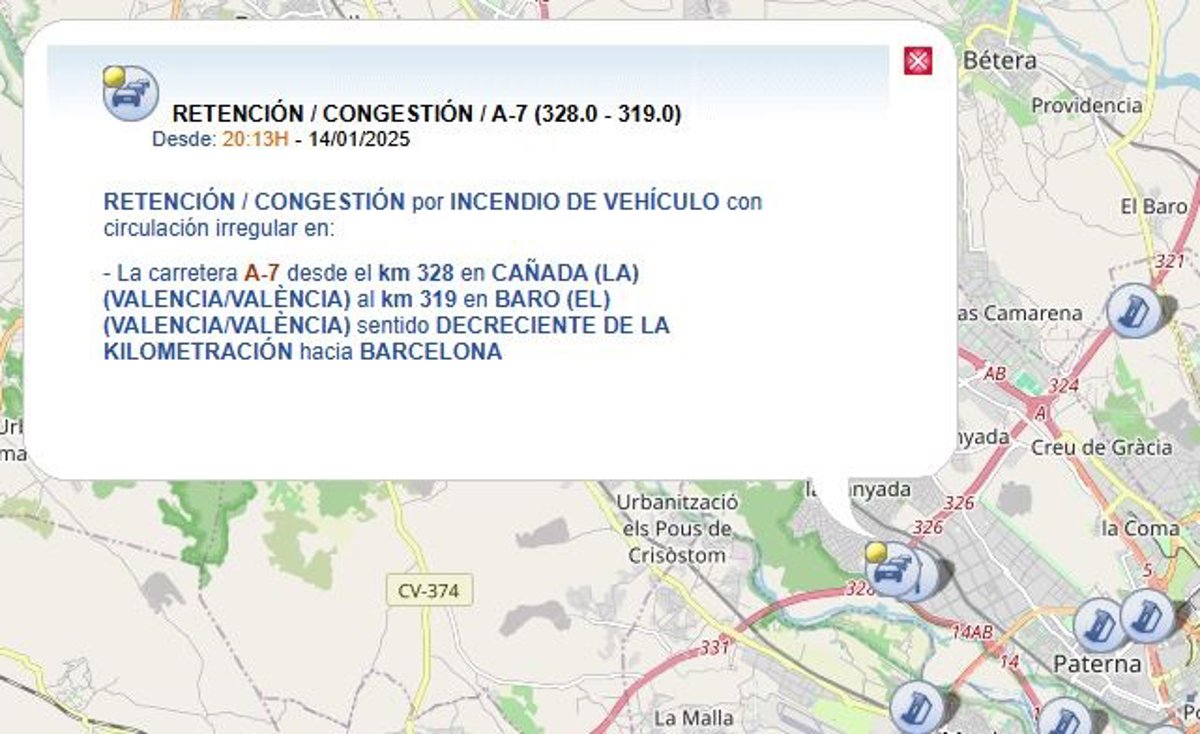 El incendio de un camión deja 9 kilómetros de retenciones en la A7 hasta La Canyada - DGT
