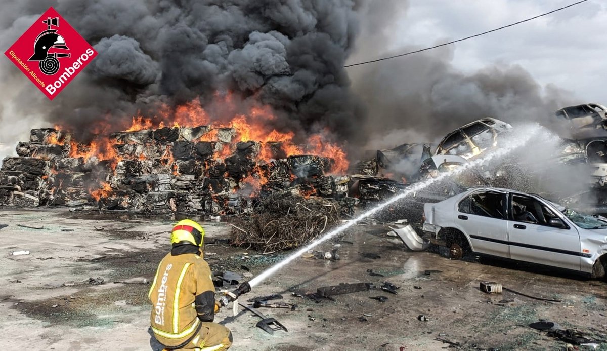 Un incendio en un desguace de coches en Crevillent (Alicante) ha calcinado varios vehículos que se encontraban allí aparcados. Efectivos del Consorcio Provincial de Bomberos de Alicante trabajan durante el mediodía de este miércoles en la extinción de las llamas.