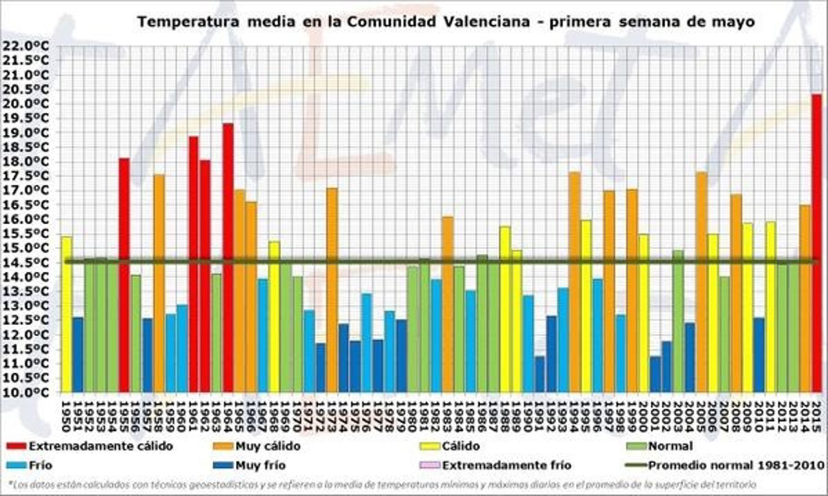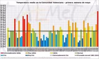 Este inicio de mayo ha sido el más caluroso en la Comunitat Valenciana desde que se tienen recursos ya que la temperatura de esta primera semana en el promedio del territorio ha sido 5.8ºC superior al promedio normal 1981-2010, según señala Aemet en su cuenta oficial de Twitter.