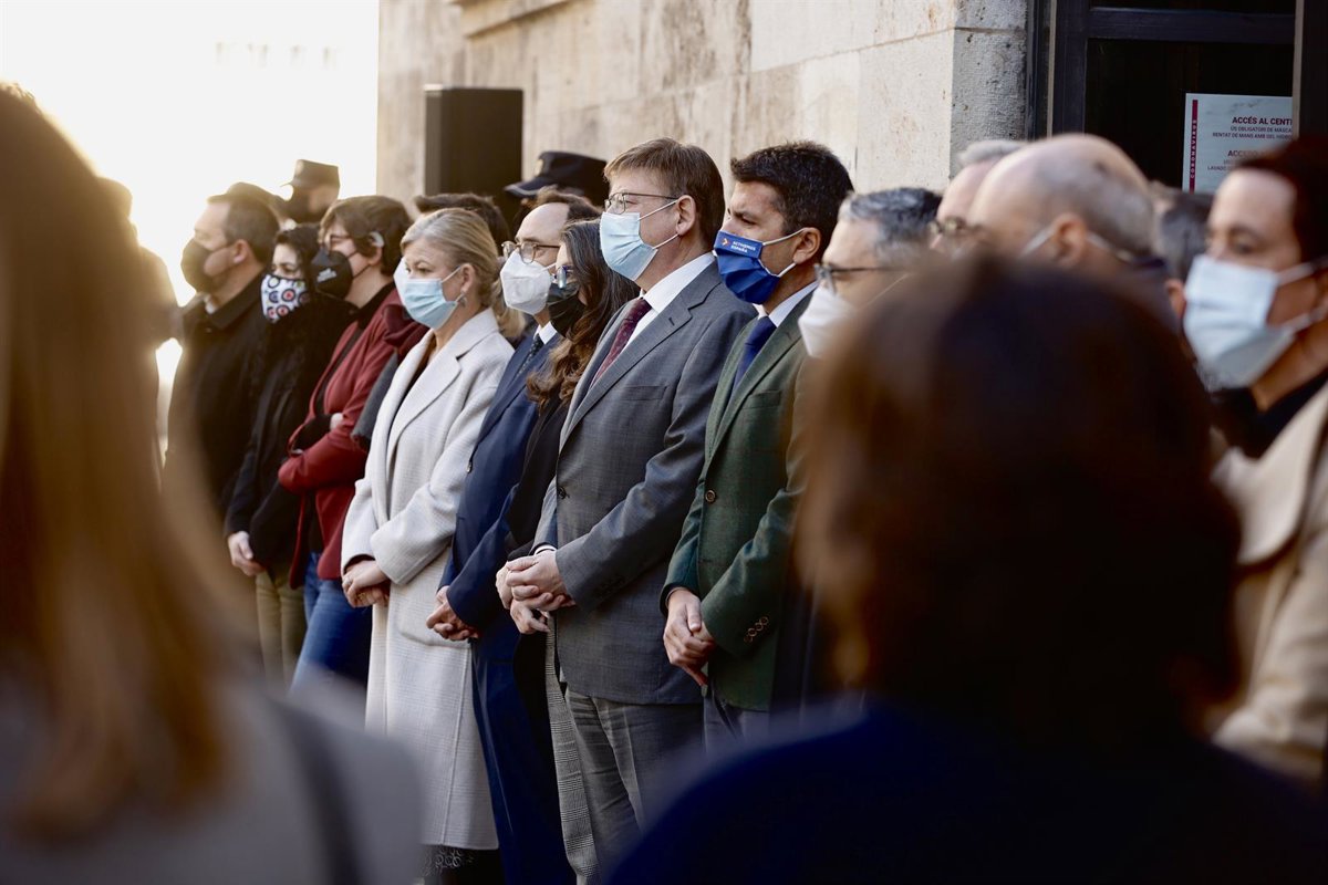 En la concentración han participado representantes de la sociedad civil, sindicatos y patronal, partidos políticos y el gobierno autonómico encabezado por el 'president', Ximo Puig, dentro del Pacto Valenciano contra la Violencia de Género y Machista.