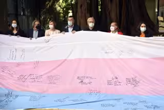 Representantes de la Generalitat, Les Corts y el Ayuntamiento de València han firmado este viernes la bandera trans, que recorre España desde el 23 de marzo, como muestra de apoyo a la Ley Trans estatal que se debate la próxima semana en el pleno del Congreso.