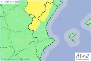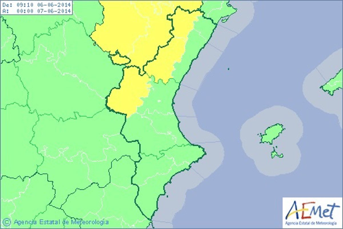 El interior de la provincia de Castellón y el interior norte de Valencia están en alerta amarilla, riesgo, por tormentas ya que se prevén chubascos que pueden ser localmente fuertes en el interior de la mitad norte por la tarde, según ha informado la Agencia Estatal de Meteorología (Aemet).