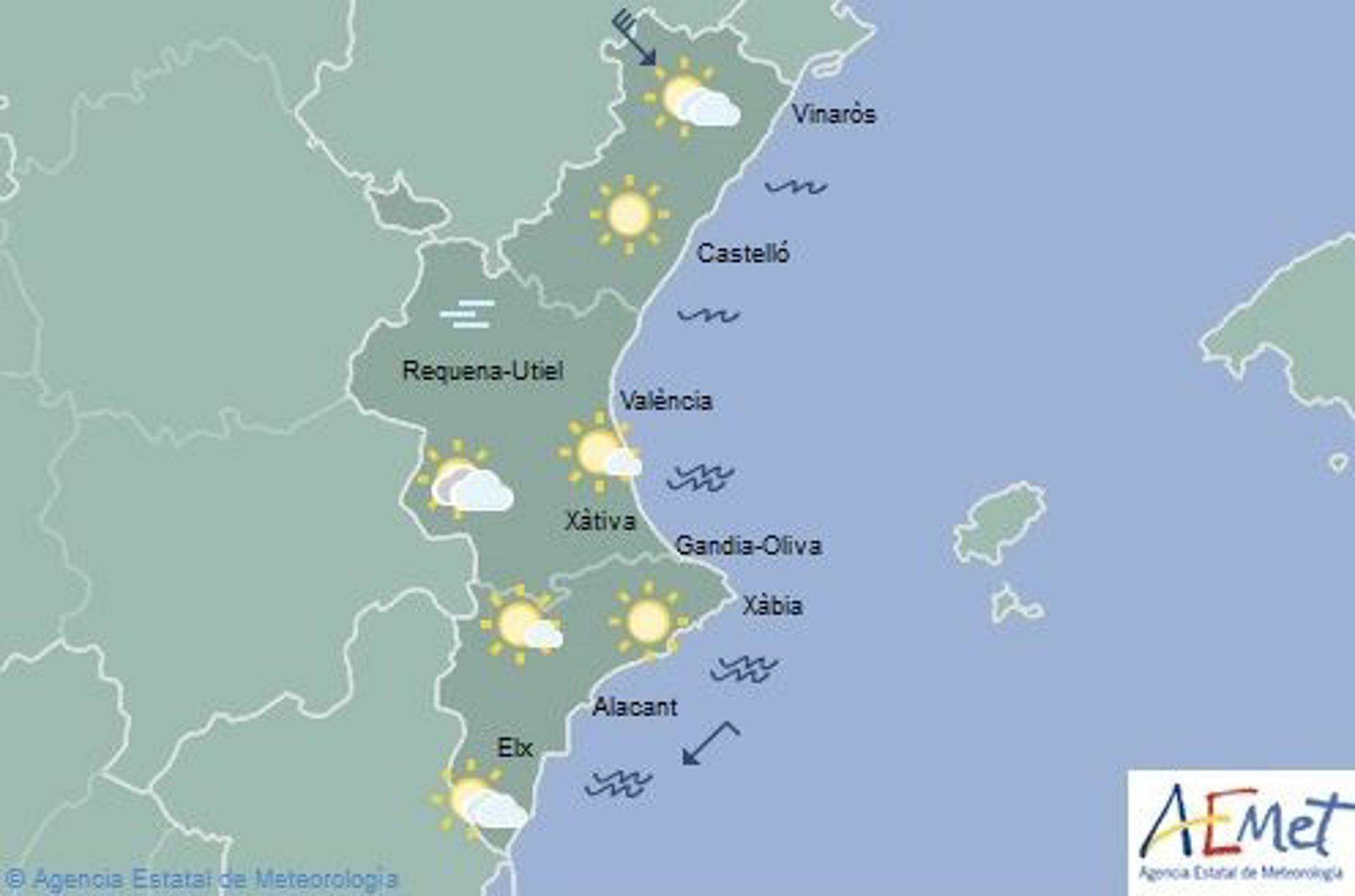 Asimismo, en el interior norte de Castellón soplará viento del noroeste moderado con algún intervalo de fuerte por la mañana; en el resto, viento variable flojo.