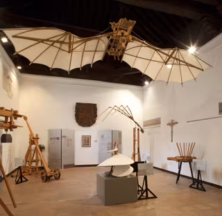 Las 21 maquetas son de las máquinas basadas en los diseños recogidos en los dos volúmenes del Códice de Madrid, conservado en la Biblioteca Nacional, y en el Atlántico, conservado en la Biblioteca Ambrosiana de Milán. A partir de los dibujos, arquitectos, carpinteros y artesanos han recreado las máquinas que ilustran bellamente la manera de concebir la tecnología que tenía Leonardo.