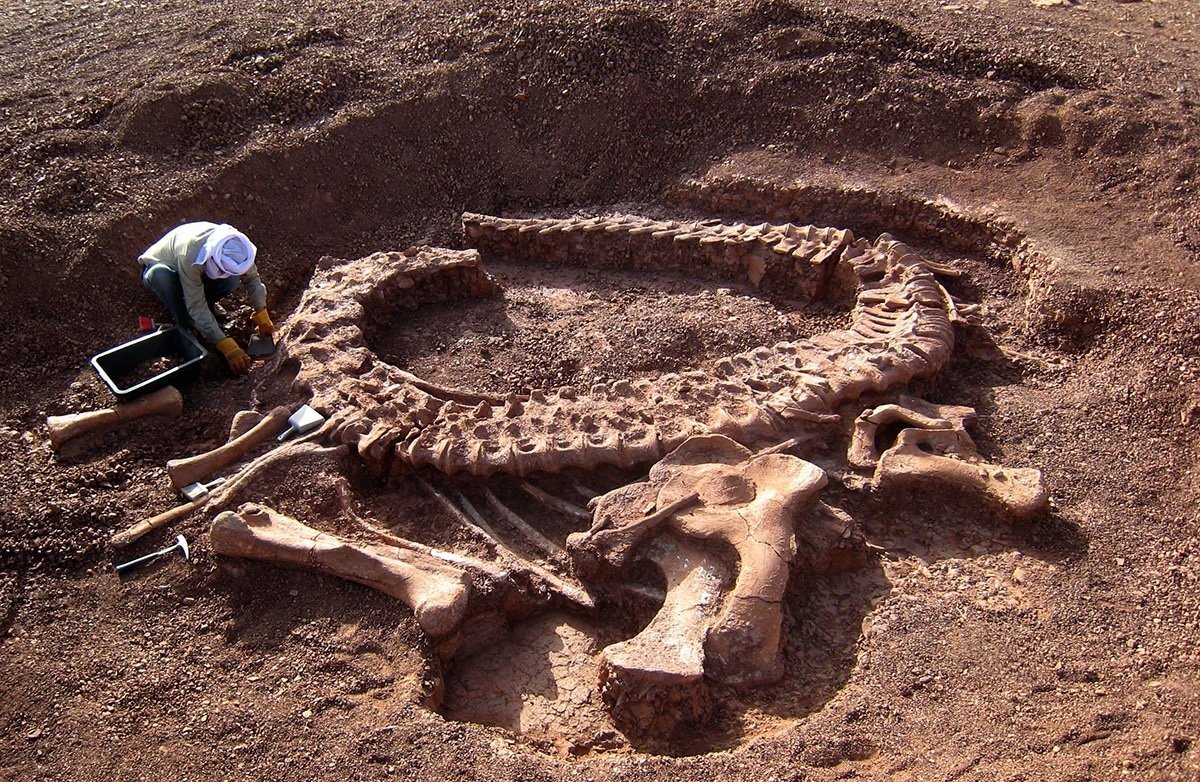 Un paleontólogo trabaja sobre el cuello de un saurópodo. - MUPE - Archivo