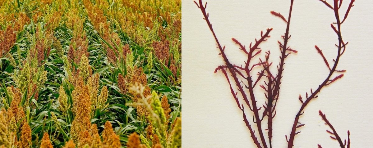 Imagen de un cultivo de sorgo y del alga roja Gelidiun corneum. - PIXABAY Y COMMONS WIKIMEDIA