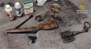 También en Alcoi, agentes del Seprona de la Guardia Civil de Ibi, en colaboración con la Unidad Canina de Detección de Venenos de la Guardia Civil de Valncia, han intervenido una importante cantidad de productos fitosanitarios de uso prohibido, dos jaulas-trampa para la captura de animales, 16 cepos de distintos tipos, dos carabinas de aire comprimido y una pistola.