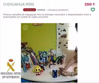 La Guardia Civil de Castellón investiga a una mujer por la venta de cachorros de perro gravemente enfermos, de raza chihuahua, a través de internet en varias provincias, como León, A Coruña y Lugo. Al llegar a manos de los compradores, los animales estaban en tales condiciones que tenían que ser hospitalizados y finalmente acababan falleciendo.