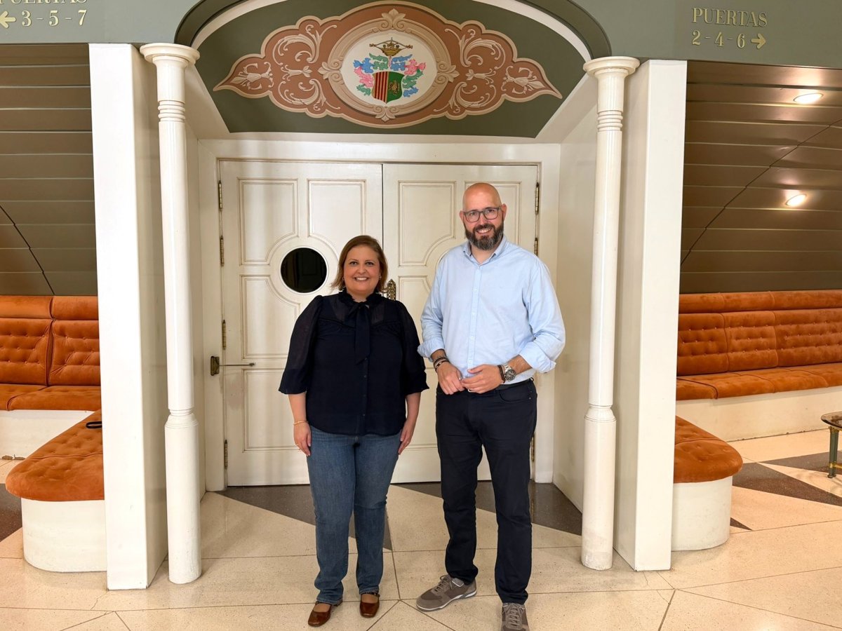 La concejala de Juventud de Orihuela, Anabel García (i), y el director general del IVAJ, Vicente Ripoll (d), en el Teatro Circo - GVA
