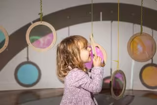 'La Juguetoría' es una instalación de juego libre dirigida a la primera infancia. El taller transforma el IVAM en una factoría de experiencias lúdicas a través de una instalación de objetos que se convierten en juguetes diferentes con cada gesto, decisión y acción compartidos. Esta colección particular de piezas, diseñadas por Sara San Gregorio y producida por Alicia Gutiérrez para el IVAM, anima a las niñas y niños a explorar con luz, reflejos, volumen, texturas o construcciones.