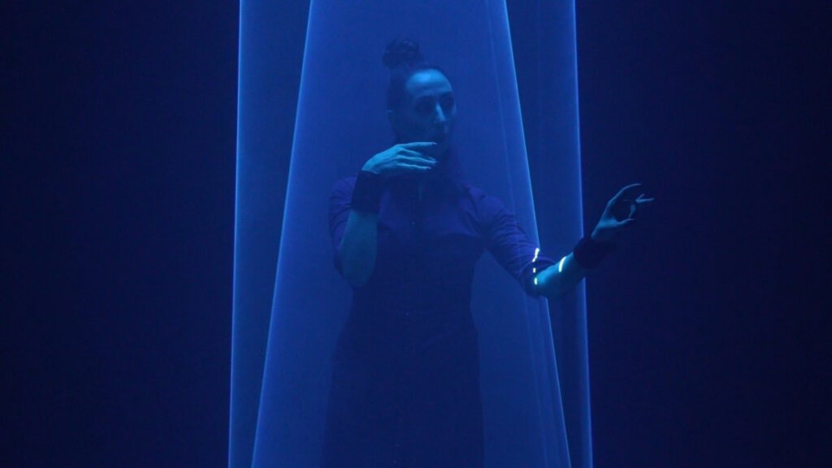 Muriel Romero interpreta esta pieza concebida y creada por ella misma y por Pablo Palacio desde Instituto Stocos. Este proyecto está centrado en el análisis y el desarrollo de la interacción entre el gesto corporal, el sonido y la imaginería visual.