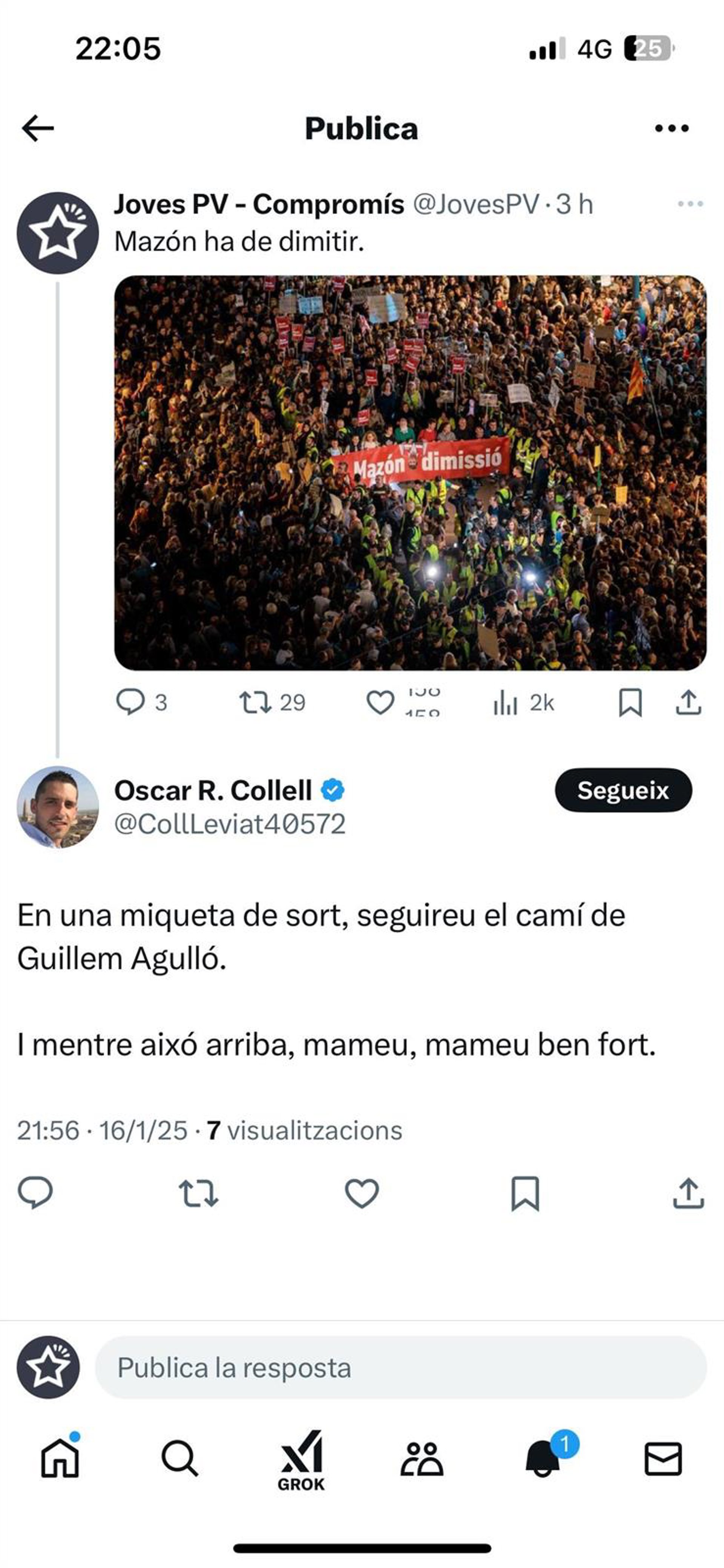 Las juventudes de Compromís han anunciado que presentarán una denuncia ante la Fiscalía por delito de odio contra el exportavoz del Partido Popular en Càlig (Castellón) Óscar Robles Collell. Así lo han hecho saber después de que, en respuesta a una publicación exigiendo la dimisión del presidente de la Generalitat, este candidato del PP escribiera un mensaje "amenazando de muerte": 'En una miqueta de sort, seguireu el camí de Guillem Agulló' ('Con un poquito de suerte, seguiréis el camino de Guillem Agulló')".