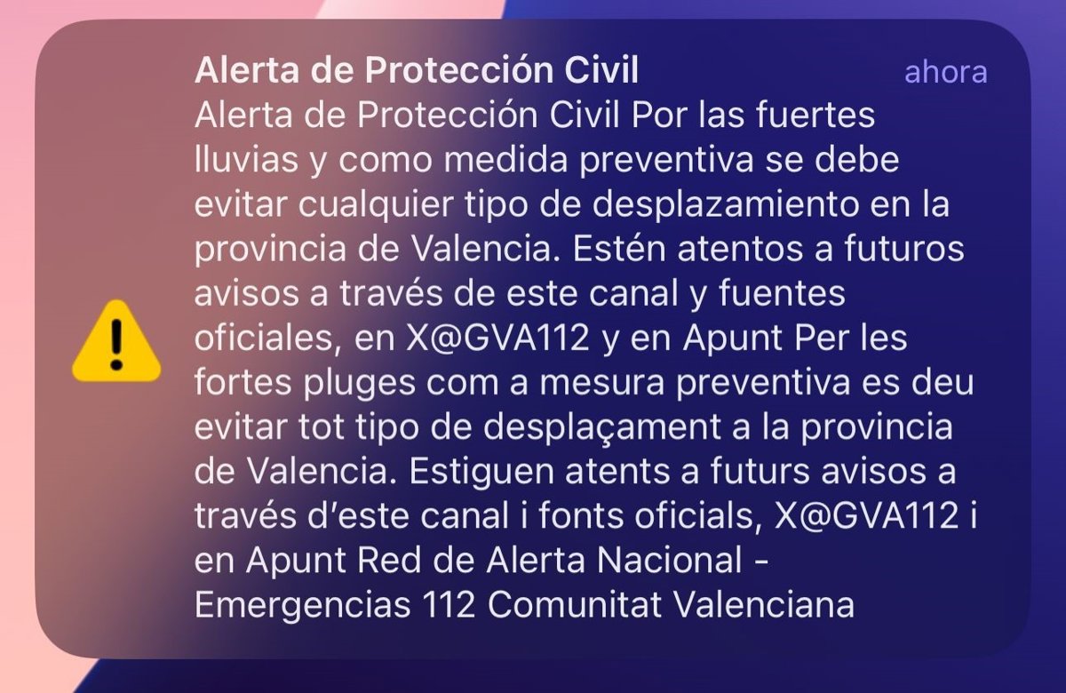 "Ante las situaciones derivadas por las fuertes lluvias en su zona, como medida preventiva, permanezcan en sus domicilios y estén atentos a futuros avisos a través de este canal y fuentes oficiales", señalaba la propuesta, escrita en castellano, valenciano e inglés.