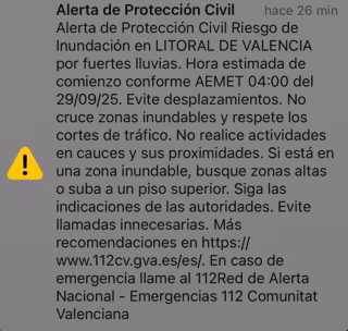 En el caso de Valencia, el mensaje fijaba la hora estimada de inicio en las 4.00 horas del lunes y pdía evitar desplazamientos, no cruzar zonas inundables y respetar los cortes de tráfico. También que no se realizaran actividades en cauces y sus próximidades y pedía, en cao de estar en zona inundable, buscar zonas altas o subir a pisos superiores; seguir las indicaciones de las autoridades y evitar llamadas innecesarias.