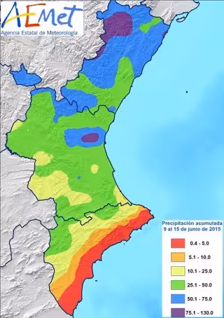 Las tormentas que se han registrado estos días en diversos puntos de la Comunitat, han sido especialmente significativas en varias zonas como la del aeropuerto de Manises (Valencia), con 110 litros por metro cuadrado acumulados entre el pasado sábado y el lunes. Así, en tres días de tormenta, junio de 2015 se ha convertido en el más lluvioso de la serie histórica --desde 1966-- en esta zona.