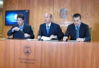 El portavoz adjunto del equipo de Gobierno de la capital alicantina, Juan Seva, ha comparecido este lunes en rueda de prensa para informar sobre el acuerdo acompañado por el concejal de Atención Urbana, Andrés Llorens, y por el técnico municipal adscrito al área, Jesús Rubio.